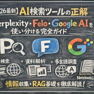 2026年のAI検索はPerplexity・Felo・Gemini・NotebookLMの「多刀流」が正解。速報性・資料解析・多言語調査・信頼性確保の4場面別の使い分け方法とRAG技術の基礎を解説。情報収集の質とスピードを劇的に向上させる実務ガイド。