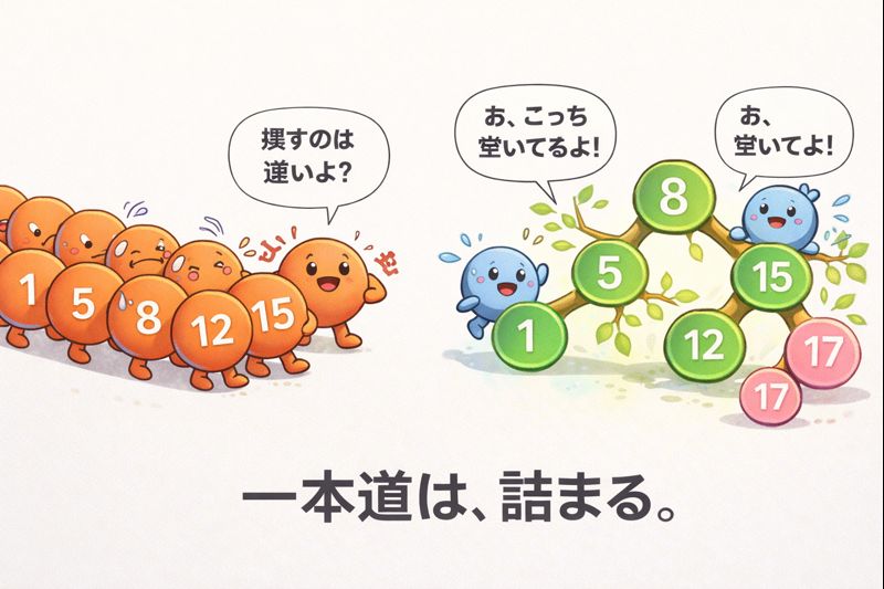 しかし、コンピュータ科学の歴史には、この絶望的な二律背反を鮮やかに、そして極めて巧妙に打ち破った発明が存在します。それこそが「二分探索木(にぶんたんさくき)」、別名「ふたまたニョキニョキ」です。