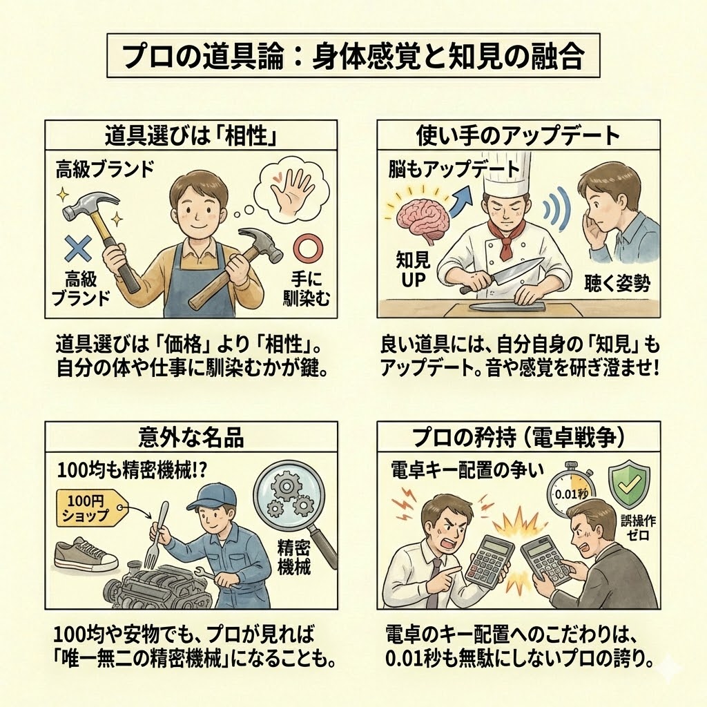 - プロの道具選びは価格やブランドではなく、自分の身体感覚や特定のタスクに「いかに馴染むか」という実用性で決まる。