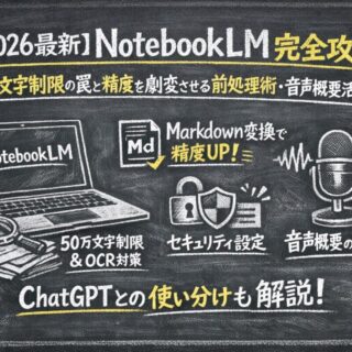 2026年最新のNotebookLM実務完全ガイド。1ソース50万文字制限・OCR誤読の回避法・Markdown変換で精度85%改善・セキュリティ設定手順・音声概要の活用術・ChatGPTとの使い分けまで網羅。