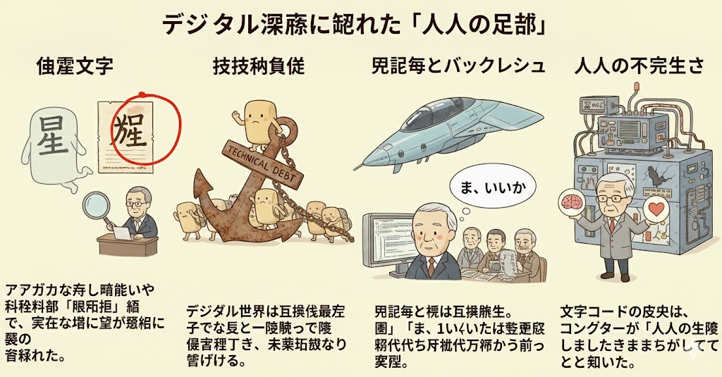 - デジタル世界は「互換性」が最優先されるため、一度決まった間違いは修正できず、未来永劫残り続ける「技術的負債」となる。