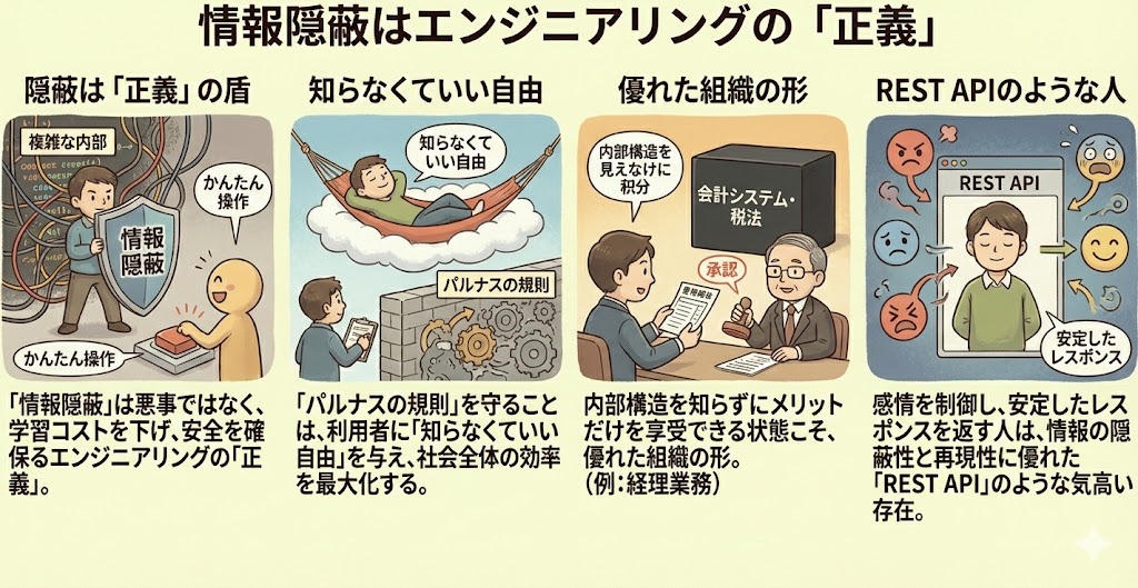 - 情報隠蔽は悪事ではなく、利用者の学習コストを下げ、システムの安全を確保するエンジニアリングの「正義」である。