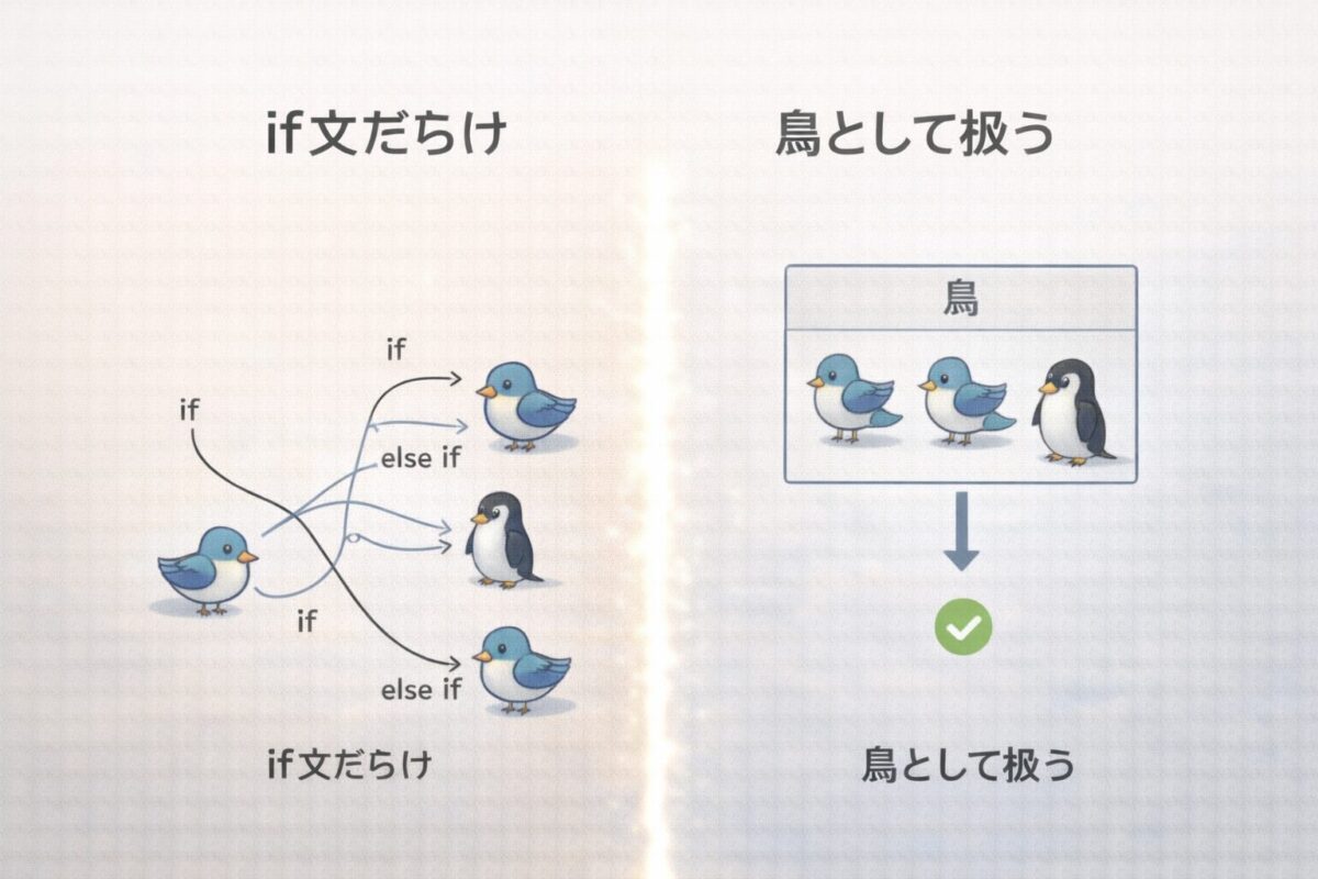 例えば、あなたの手元に「鳥リスト」があるとします。中身はペンギン、鳩、キツツキ、ダチョウ……バラバラです。でも、あなたは中身を確認する必要はありません。ただ「鳥」という抽象概念に向かって、「餌を食べろ」と一言命じるだけでいいのです。