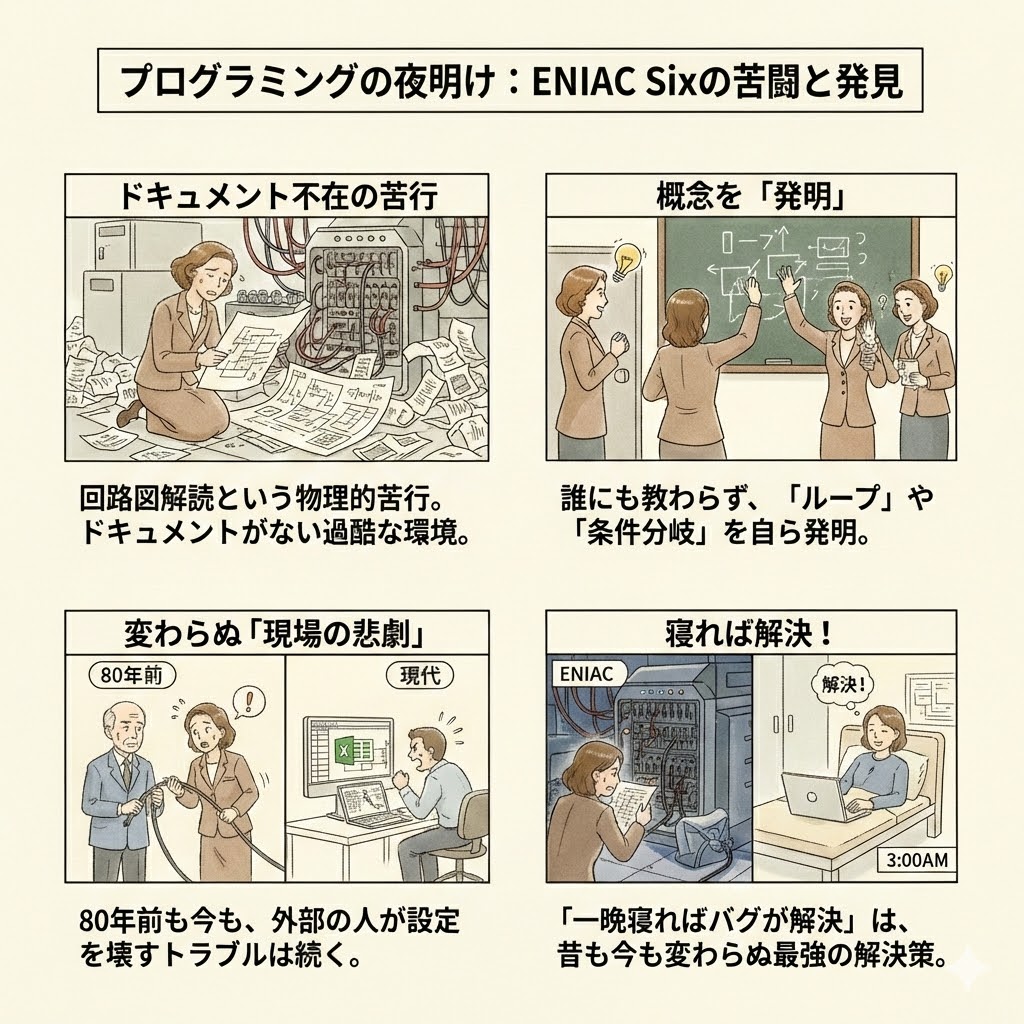 - 世界初のプログラマー(エニアック・シックス)は、現代以上に過酷な「ドキュメント不在」の環境で、回路図の解読という物理的な苦行を強いられていた。