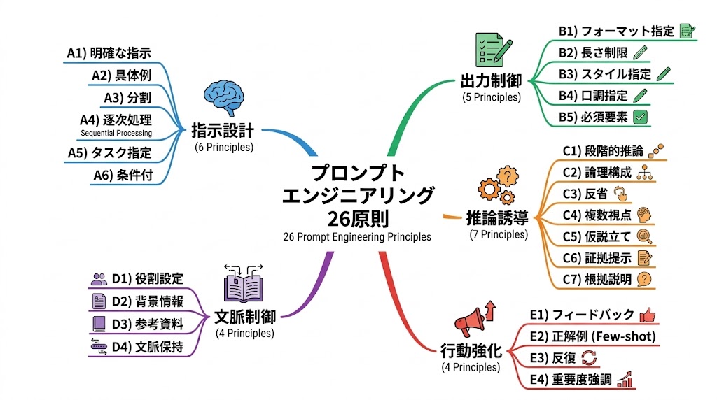 📌 要点:26原則は「指示設計・出力制御・推論誘導・文脈制御・行動強化」の5カテゴリに分類できる。まず各カテゴリの役割を理解してから個別の原則に入ると体系的に習得できる。