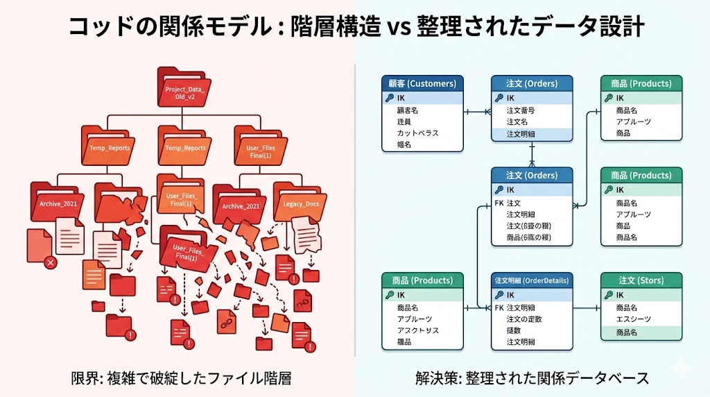 📌 要点:フォルダ構造は「物理的な場所」で整理する思想。関係モデルは「論理的な意味」で整理する思想。現実の業務は多対多で絡み合うため、フォルダでは限界が来る。