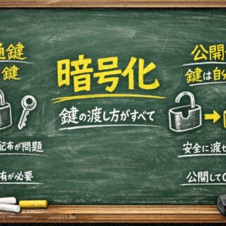 暗号化(共通鍵・公開鍵)を「南京錠を相手に送りつけて鍵は自分だけが持つ」比喩でゼロから解説。HTTPSの仕組み・デジタル署名・ハッシュ関数まで。高校情報Ⅰ・ITパスポート対応。