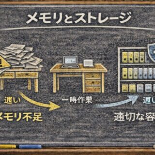 PCのメモリとストレージの違い、「作業机と書類棚」の比喩で完全理解。8GBと16GBどちらを選ぶべきか、気発性・スワップの仕組みまで解説。今すぐPC選びに活かせます。