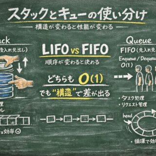 IT・コンピュータ基礎 スタックとキューの使い分け完全ガイド|計算量から物理構造まで徹底解説 スタックとキューの決定的な違いと使い分けを情シス22年が解説。LIFO/FIFOの概念からCPUキャッシュ効率・循環バッファの仕組み、Java/Pythonの実装例まで網羅。計算量O(1)の裏にある物理層の最適解がわかります。 2025.12.27 IT・コンピュータ基礎