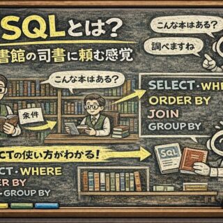 SQLを「図書館の司書に条件を伝えて本を出してもらう」比喩でゼロから解説。SELECT・WHERE・ORDER BY・JOIN・GROUP BYまで。高校情報Ⅰ・ITパスポート対応の丁寧な入門記事。