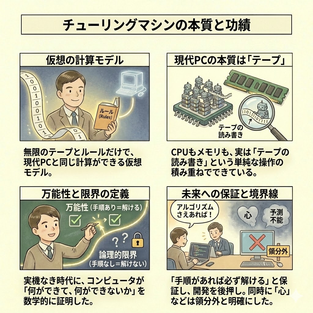 チューリングの本当の凄さは、実物のコンピュータが生まれる前に「コンピュータにできることとできないこと」を明確に定義してしまった点にあります。彼は論理的に、以下の2点を証明しました。